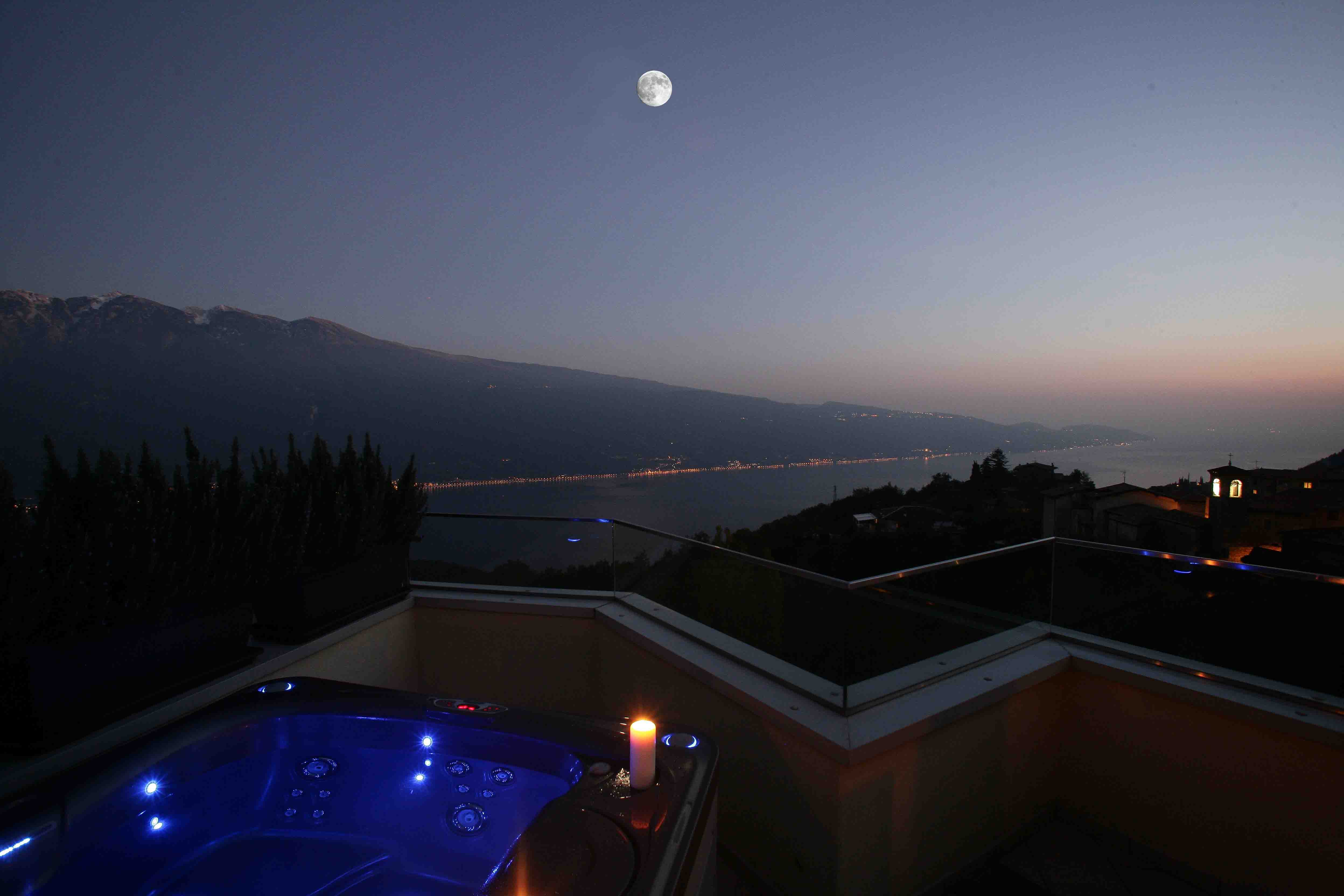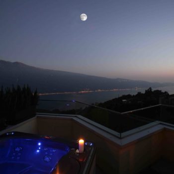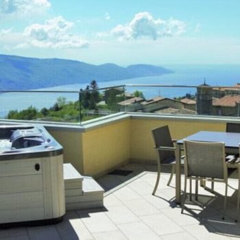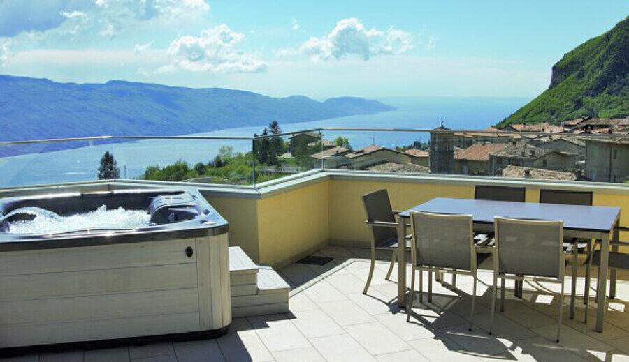 L’elegante e attrezzato appartamento si trova in posizione tranquilla nella frazione Aer di Tignale e dispone di grande terrazza sul tetto con vasca idro massaggio privata. Dalla terrazza, arredata con tavolo, sedie, lettini, ombrellone e belle piante si gode di una vista incomparabile del lago.
