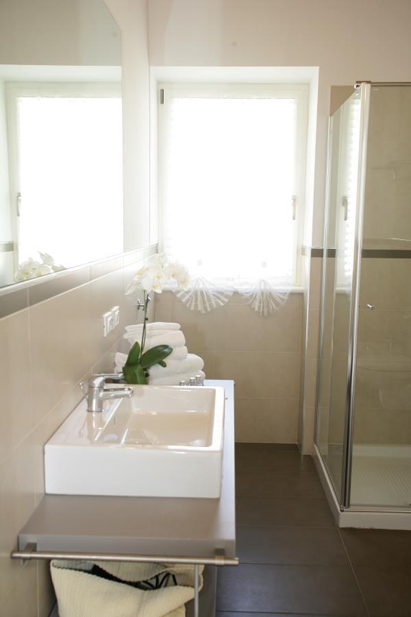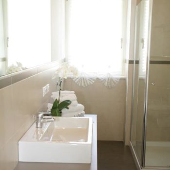 L’ampio bagno con doccia, WC, bidet e lavabo offre molto spazio per i propri oggetti personali. Lenzuola ed asciugamani sono naturalmente a disposizione. Tutto l’appartamento è ben abbinato sia nel colore che nello stile. Quadri originali non mancano, così come arredi e dettagli che rallegrano anche una giornata piovosa.